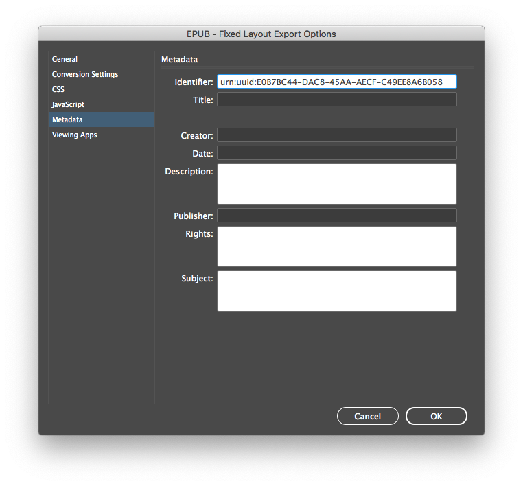 When using InDesign, these fields can be filled during the export process.