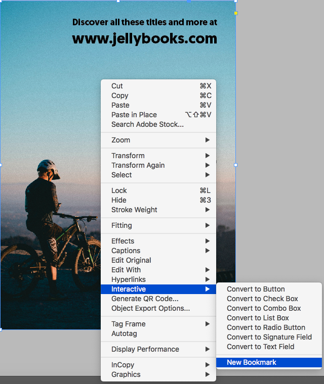 To add a bookmark, select a page, right-click and select “Interactive > New Bookmark”.