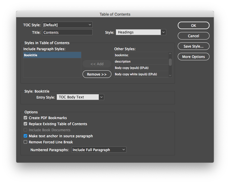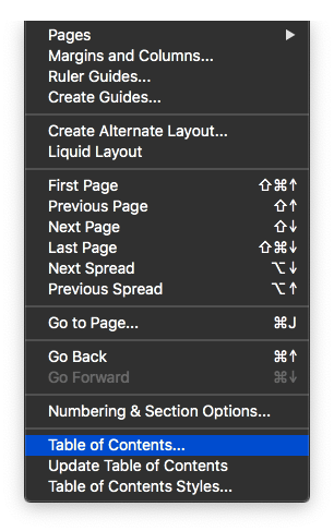 If you already have a table of contents in your catalogue, then using a TOC Style is the easiest way to create the EPUB TOC. If you used the “Table of Contents” entry in the “Layout” menu, so you can either create a new one or update the existing style.