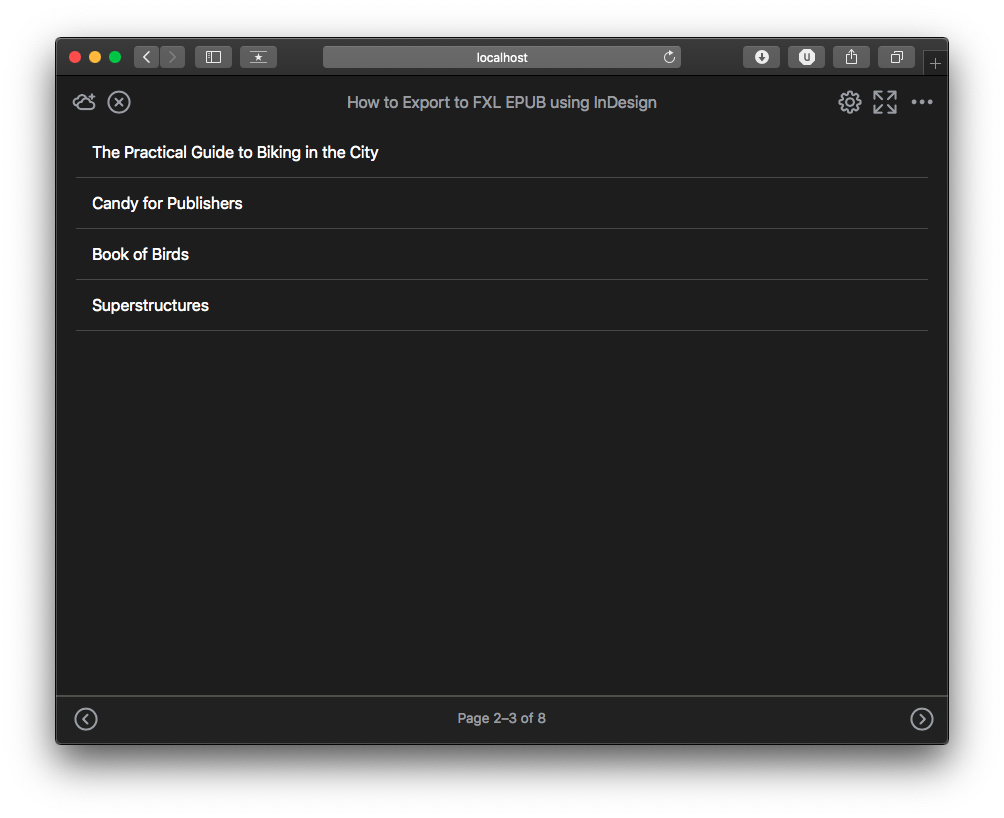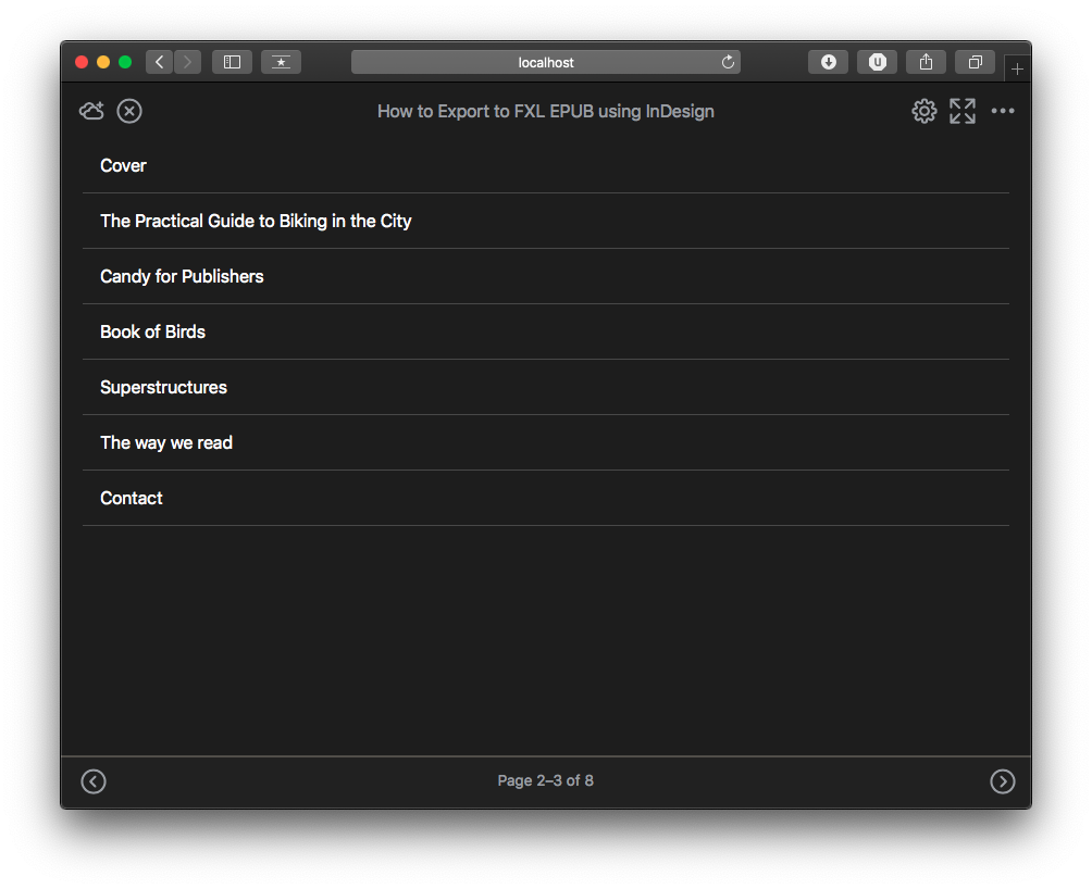 When using InDesign you could either use TOC style or PDF bookmarks to generate the table of contents. This will then define the table of contents that readers will encounter in the user interface of the Jellybooks Cloud Reader. As a reference, you can check the appearance of the table of contents you have designed in apps such as iBooks or Adobe Digital Editions 4.5.