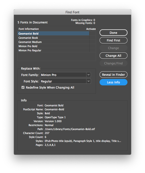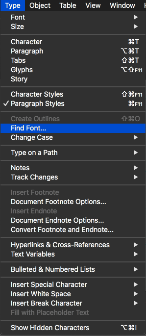 It is also good practice to check that none of your fonts are missing. You can do so by going to the “Type” menu and clicking “Find Font.”