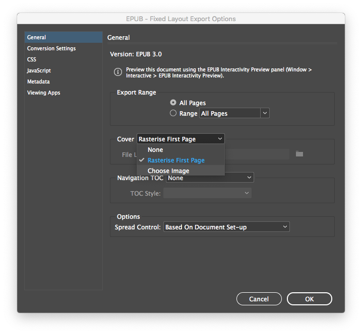 As the Jellybooks Cloud Reader handles FXL EPUB files in the same way as a PDF reader would handle a PDF file, the cover should be the first page of the publication. Therefore we can “Rasterize First Page” for the cover.